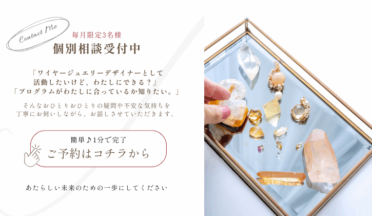 ベーシックコースでは、毎月、異なる天然石を使って、可愛らしくエレガントなワイヤージュエリーを制作します。